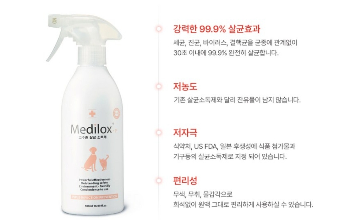 메디록스 Medilox-P는 99.9%의 강력한 살균효과를 자랑합니다. 이는 특히 냄새를 유발하는 암모니아와 반응하여 악취를 신속하게 제거하는 데 효과적입니다.